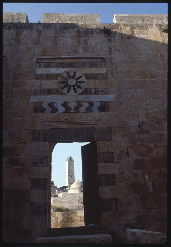 منظر لمئذنة المسجد الكبير (مقام النبي إبراهيم العلوي) من قاعة العرش في قلعة حلب