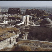 منظر من سطح قلعة حلب يظهر فيه المسجد الصغير( مقام النبي ابراهيم السفلي) ومدخل إلى قاعة العرش