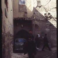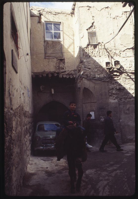 من أحد أزقة دمشق القديمة يظهر فيها طفل راكب على حمار وسيارة ونافذة مبنى قديم