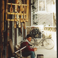 بائع في محل اواني منزلية، تظهر قوالب معمول خشبية