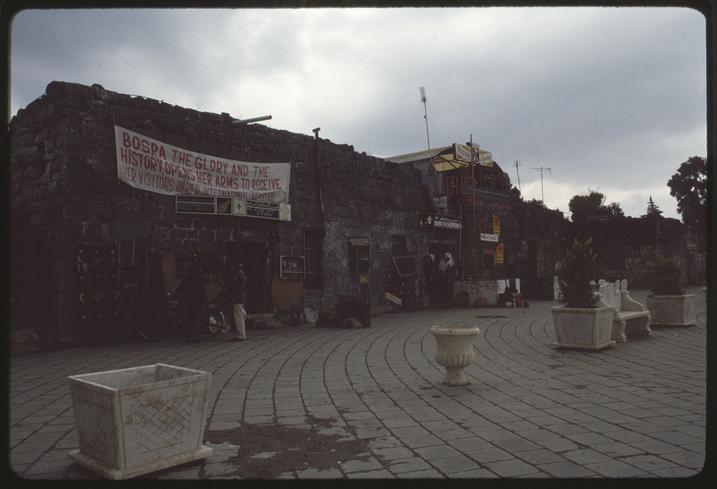 لافتة تروج لتاريخ بصرى ومهرجانها الدولي