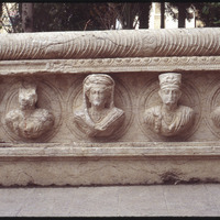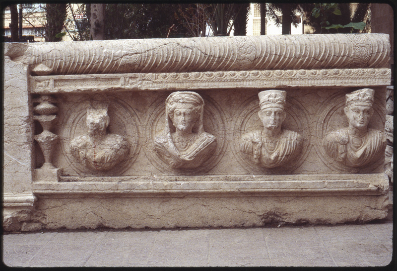 تفاصيل منحوتات لوجوه بشرية على تابوت