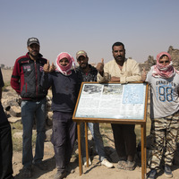 Jordan. Umm al Jimal, workers, foreman Ali Al Masaeed, Na'el Aqeel Al Masaeed, other local workers, and site steward Jehad Suleiman on far right, in front of Quarry Reservoir interpretive sign