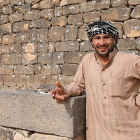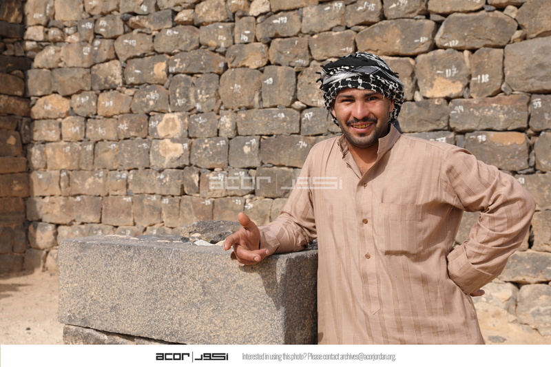 Jordan. Umm al Jimal, Ahmad Al Masaeed inside Cathedral, north wall of Cathedral in background