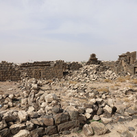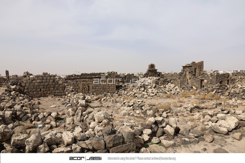 Jordan. Umm al Jimal, looking into the courtyard of Houses 103 and 104, with the Double Church in the background