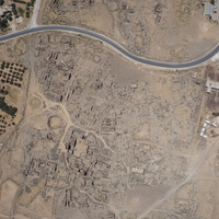 Jordan. Umm al Jimal, aerial view, modern olive tree farm, ancient animal corrals