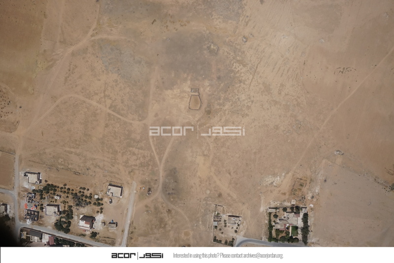 Jordan. Umm al Jimal, aerial photo featuring Umm al Jimal Municipality building in the top right corner, West Church in center, modern shops and school in bottom right corner