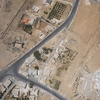 Jordan. Umm al Jimal, aerial view, town on the bottom left of site, flat area west of entry park, Commodus Gate in center