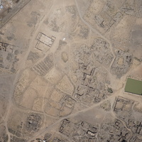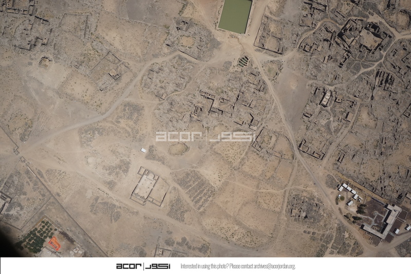 Jordan. Umm al Jimal, aerial view, west central part of the site with white caravans, at the top is the West Church