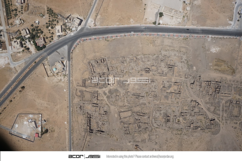 Jordan. Umm al Jimal, aerial view, southwest quadrant of site, bottom right corner is green dome of modern mosque