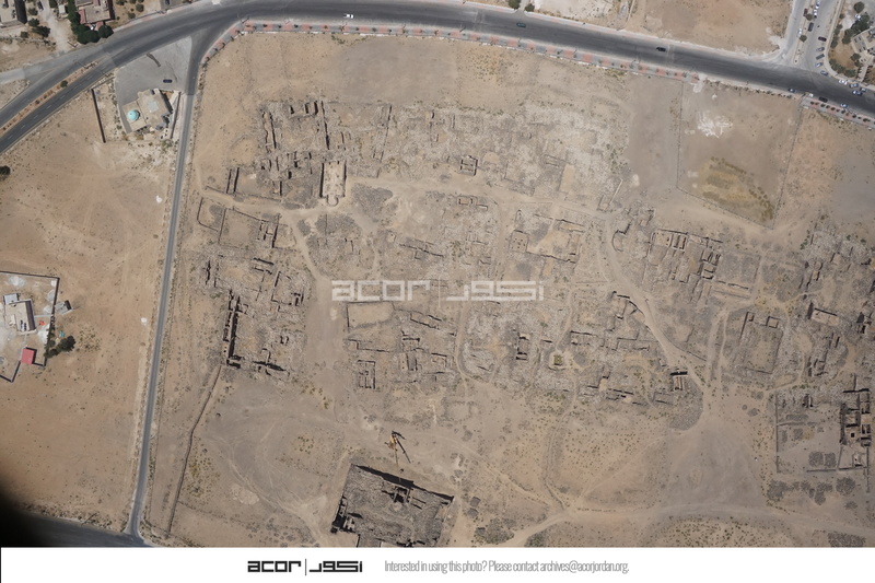 Jordan. Umm al Jimal, aerial photo featuring Interpretive and Hospitality Center on left with white moveable caravans and Barracks