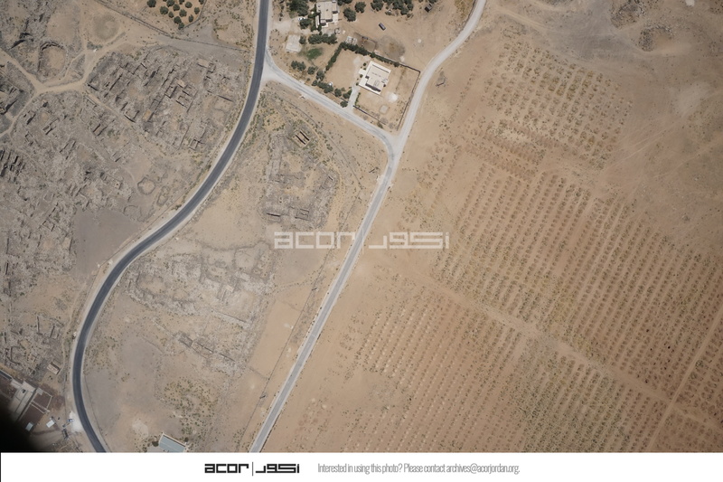 Jordan. Umm al Jimal, aerial view, northern half of picture is the archaeological site, rows of holes in ground were dug to plant trees