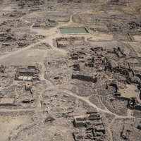 Jordan. Umm al Jimal, general aerial view of ruins with Roman Reservoir in center
