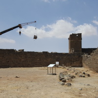 Jordan. Umm al Jimal, exterior of Barracks with chapel at center, entrance to main building on right, crane