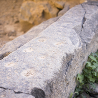 Jordan. Umm al Jimal, doorstep to Commodus Gate, holes show where mangala game was played