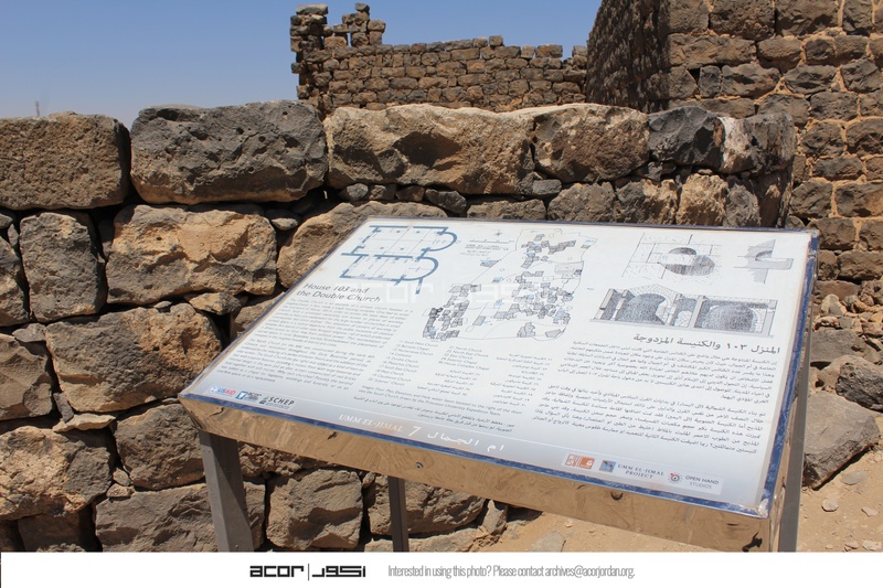 Jordan. Umm al Jimal, sign for the Double Church, both apses are shown