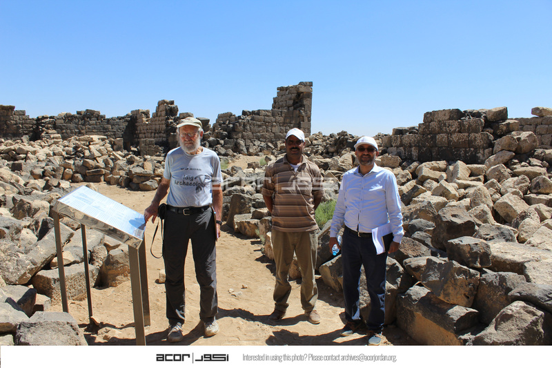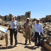 Jordan. Umm al Jimal, Bert de Vries, Ali Al Masaeed, and Jehad Haron in front of sign which discusses basalt construction methods