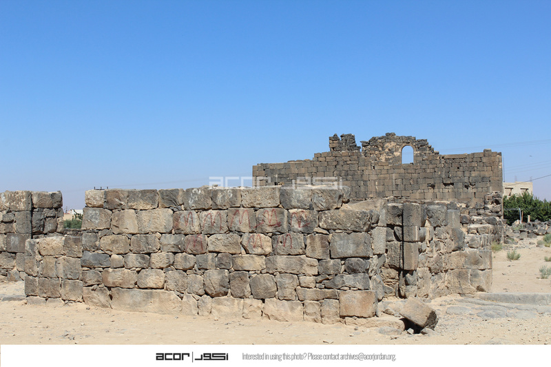 Jordan. Umm al Jimal, Commodus Gate, looking at south guardroom, West Church in background, graffiti