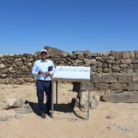 Jordan. Umm al Jimal, Jehad Haron of USAID SCHEP in front of interpretive sign for the West Church
