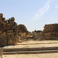 Jordan. Umm al Jimal, Cathedral, altar screen with apse in background, only the priest could cross the white step in the middle and sit on the circular throne