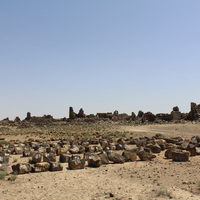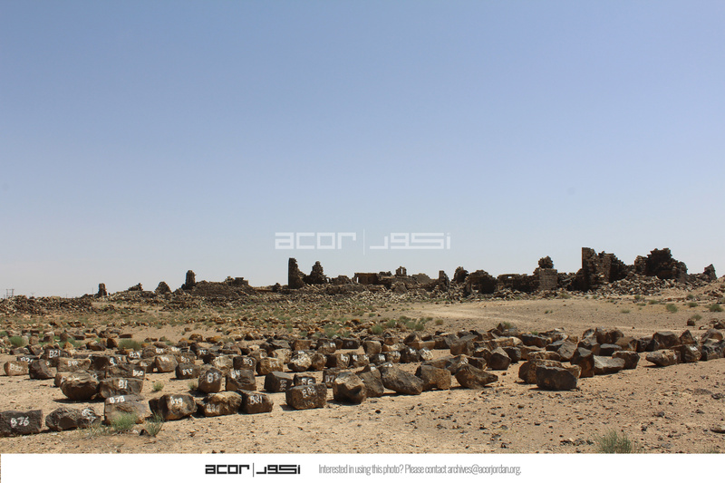 Jordan. Umm al Jimal, preparation for restoration, numbering stones, architectural fragments from Commodus Gate