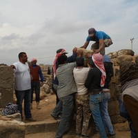 Jordan. Umm al Jimal, local workers working on the restoration of Commodus Gate