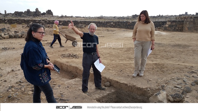 Jordan. Umm al Jimal, excavation of the Commodus Gate, ACOR director Barbara Porter, Bert de Vries, Huda Kilani of USAID SCHEP, local worker in background