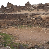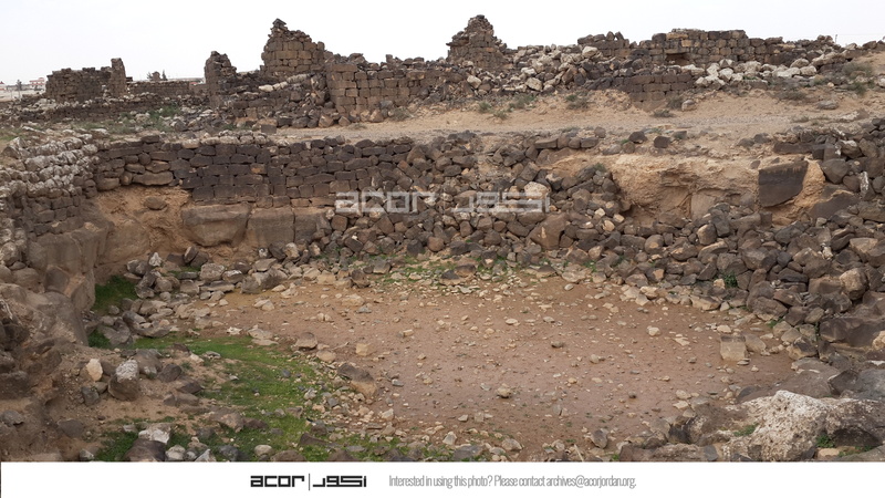 Jordan. Umm al Jimal, view of the quarry reservoir, lower layer of bedrock, from House XVII