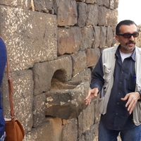 Jordan. Umm al Jimal, Ahmad Lash from the Department of Antiquities describing the holy water basin outside the door of the Double Church