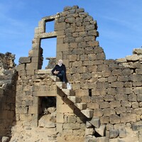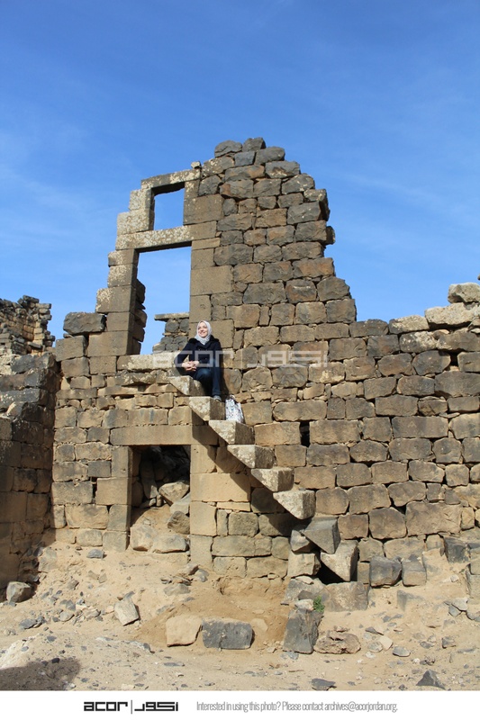 Jordan. Umm al Jimal, House XVII and XVIII, Nisreen Abu Al Shaikh on stairway