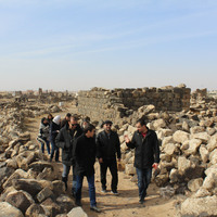 Jordan. Umm al Jimal, Nizar Al Adarbeh and visitors on interpretive trail