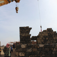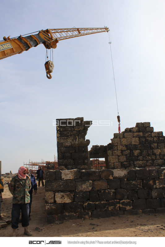 Jordan. Umm al Jimal, crane for restoration activities, visitors
