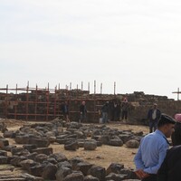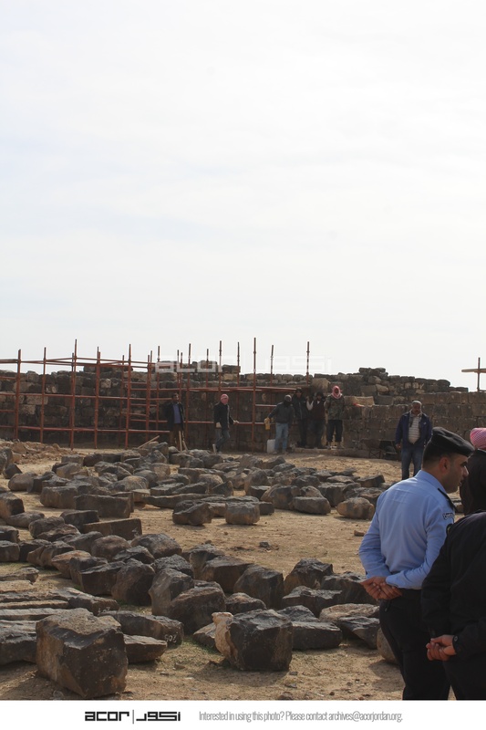 Jordan. Umm al Jimal, Commodus Gate, visitors, scaffolding in background