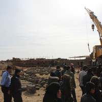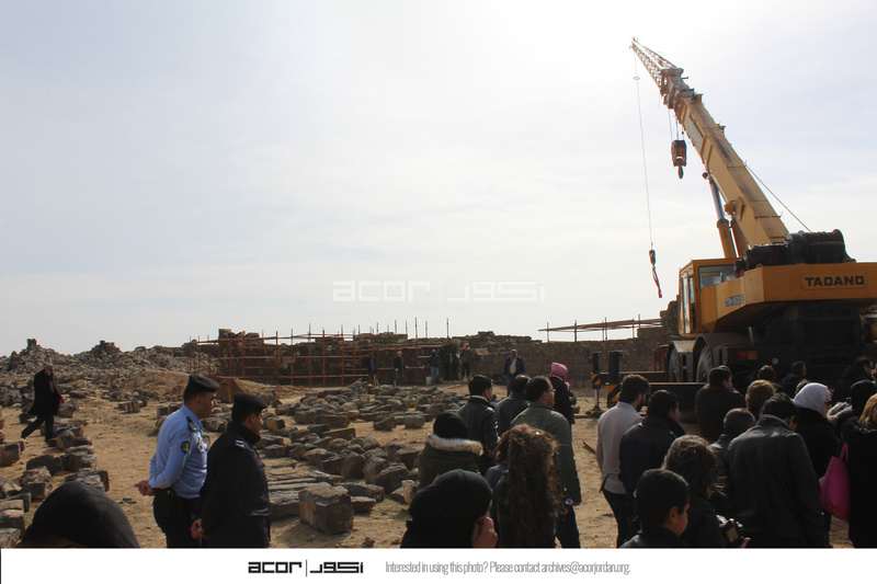 Jordan. Umm al Jimal, crane for restoration activities, visitors