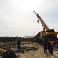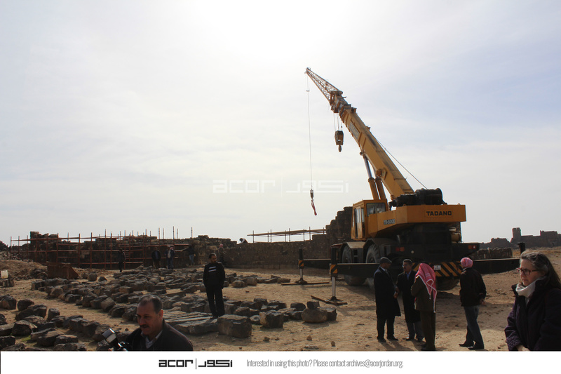 Jordan. Umm al Jimal, crane for restoration activities, Barbara Porter and other visitors