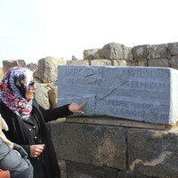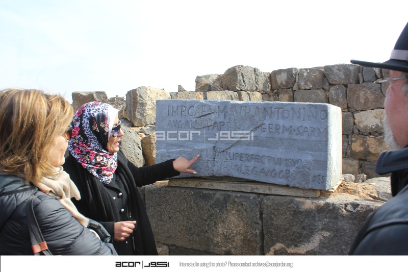 Jordan. Umm al Jimal, replica inscription for Commodus Gate in latin, visitors