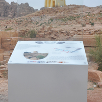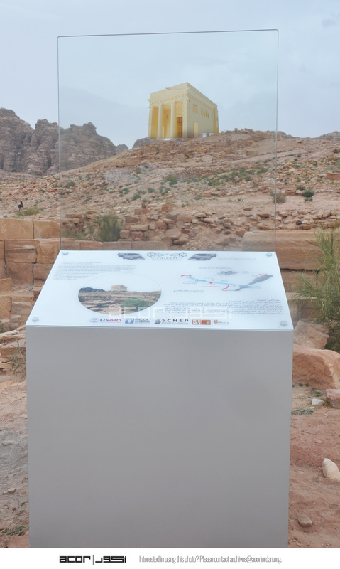 Jordan. Petra, Temple of the Winged Lions, glass sign installed on Roman Street below the temple, showing Augmented Reality (AR) presentation of the temple in the landscape