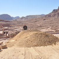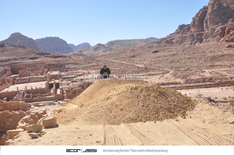 Jordan. Petra, Temple of the Winged Lions, top of southwest quadrant, soil brought from outside Petra archaeological park for backfilling, Great Temple in background