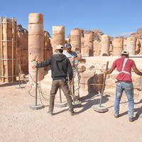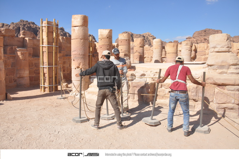 Jordan. Petra, Temple of the Winged Lions, team members placing rope barriers in front of temple podium