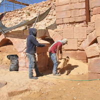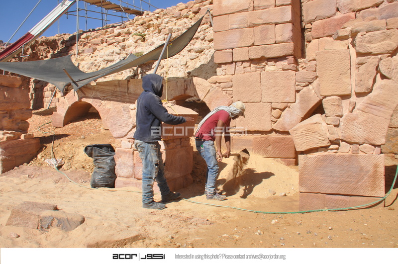 Jordan. Petra, Temple of the Winged Lions, team member depositing sand/soil into southwest quadrant for backfilling purposes
