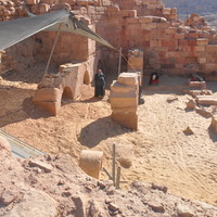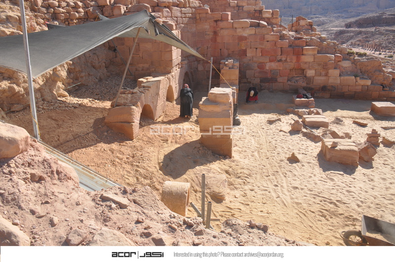 Jordan. Petra, Temple of the Winged Lions, chute, workers backfilling the southwest quadrant to help protect the rubble slope in the back from collapsing and from rainfall runoff