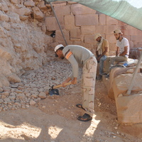 Jordan. Petra, Temple of the Winged Lions, cobble layer for southwest quadrant backfilling / buttress, team members using a hoe