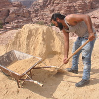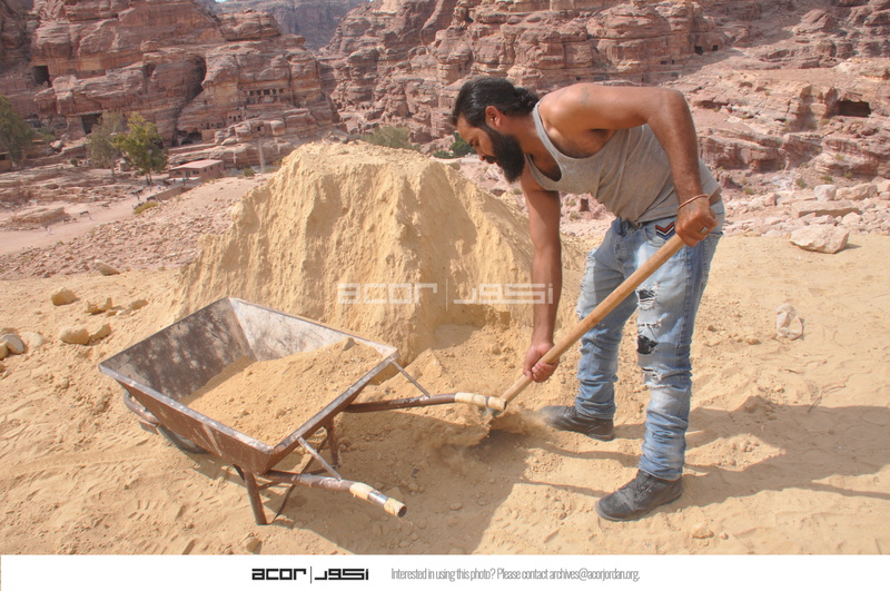 Jordan. Petra, Temple of the Winged Lions, team member shoveling sand into a wheelbarrow for backfilling of southwest quadrant