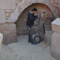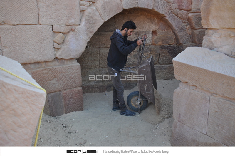Jordan. Petra, Temple of the Winged Lions, team member depositing sand/soil into southwest quadrant for backfilling purposes