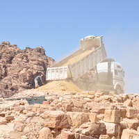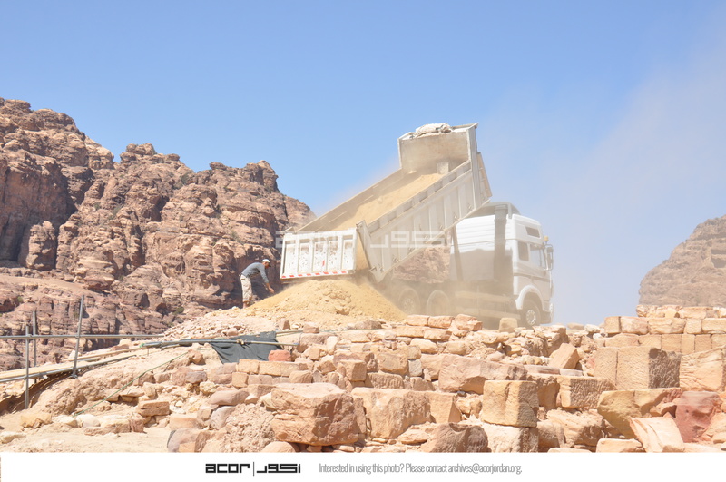 Jordan. Petra, Temple of the Winged Lions, truck delivering soil from outside the park for the purpose of backfilling