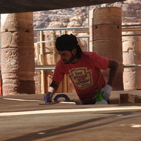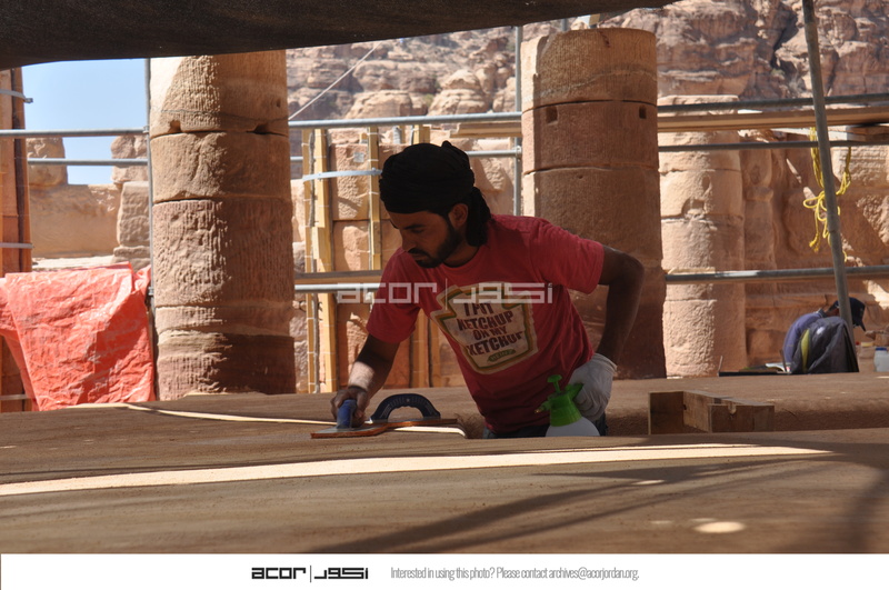Jordan. Petra, Temple of the Winged Lions, Hamza Wakyan applies final layer of mortar over cella podium