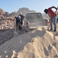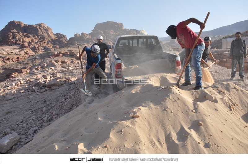 Jordan. Petra, Temple of the Winged Lions, workers shoveling sand/soil into truck for backfilling purposes in the southwest quadrant