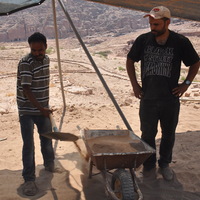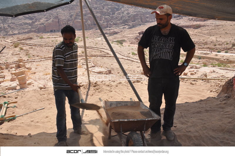 Jordan. Petra, Temple of the Winged Lions, Bassam Alfaqeer and team member shoveling soil to then be sifted for backfilling in the southeast quadrant