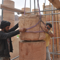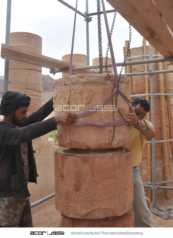 Jordan. Petra, Temple of the Winged Lions, Hamza Wakhyan and Franco Sciorilli repositioning conserved column 34 E drum. Note pre-applied mortar layer between drums