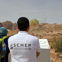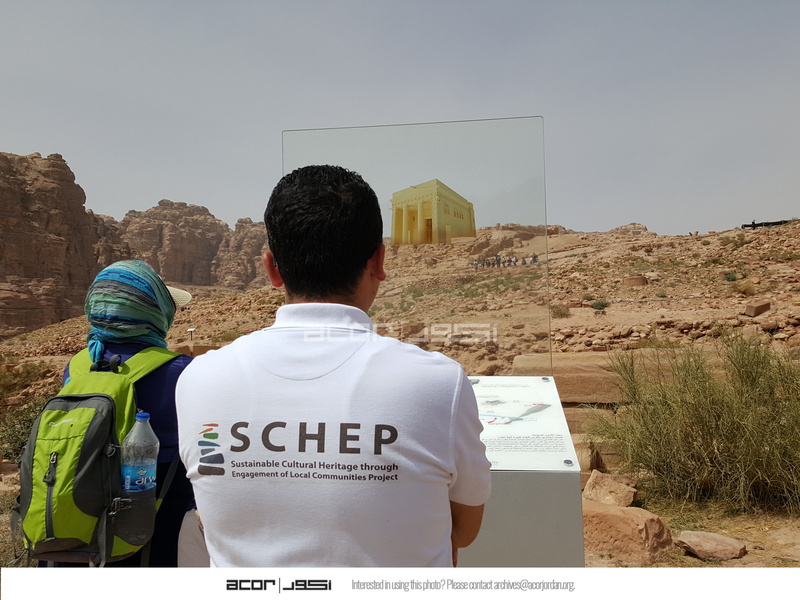 Jordan. Petra, Temple of the Winged Lions, Nizar Al Adarbeh and visitor in front of glass sign